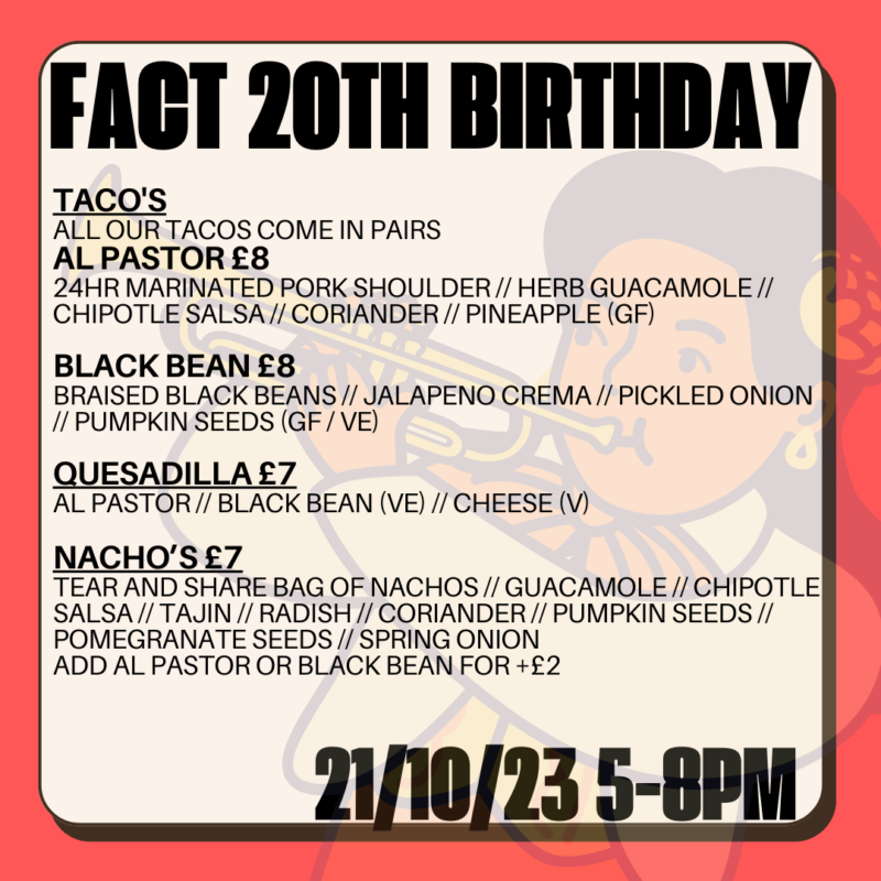 This special free event is part of our birthday celebrations, marking 20 years since FACT opened its doors in 2003. Come and celebrate with us on Friday 20 and Saturday 21 October as we look back at two decades of unforgettable moments, and look forward to what the future holds for us, you and our growing community of artists.